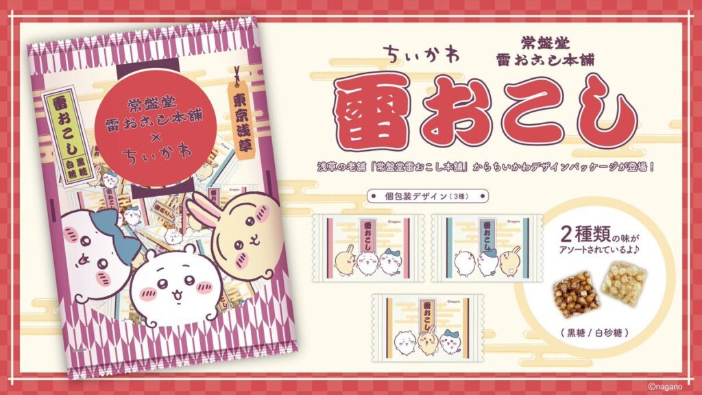 江戸銘菓・常盤堂の「雷おこし」に、ちいかわデザインのパッケージが登場! 黒糖と白砂糖の2種類の味わいを楽しめるお菓子で、かわいらしいデザインとともに手に取りたくなる仕上がりです。ちょっとした手土産にも選びやすいのが魅力です。