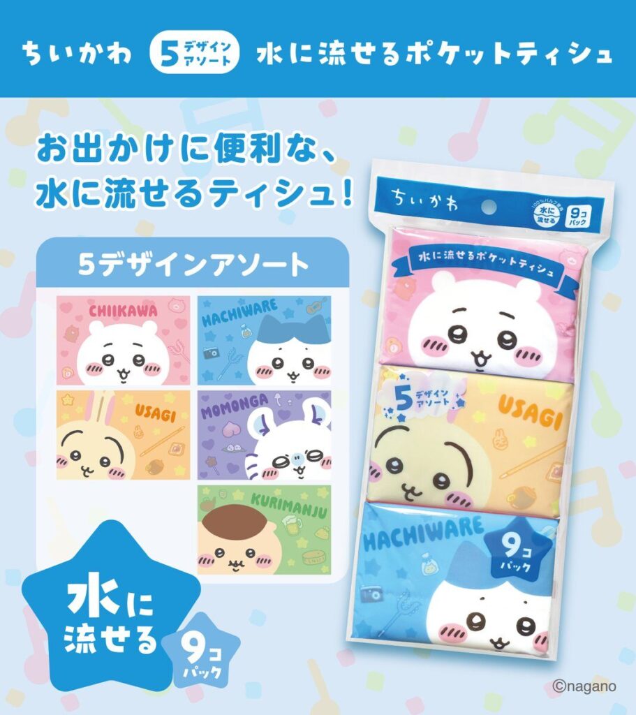 河野製紙から『ちいかわ ミニポケットティシュ6P』『ちいかわ 水に流せるポケットティシュ9P』がNEWデザインで登場! ちいかわたちのかわいいアートを楽しめるパッケージで、毎日の持ち歩きがちょっと楽しくなるアイテムです。