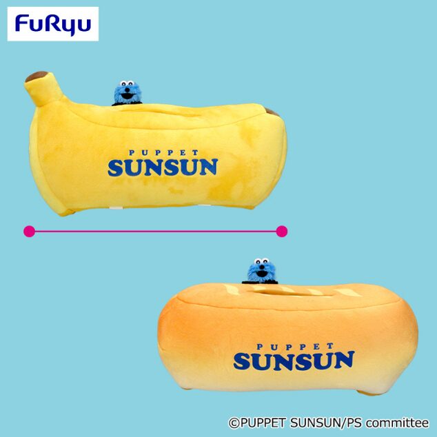 「パペットスンスン」のぬいぐるみ付きティッシュケースがクレーンゲーム景品として登場。バナナやパンのデザインのケースからスンスンがひょっこり顔を出す、ユニークなアイテムです。