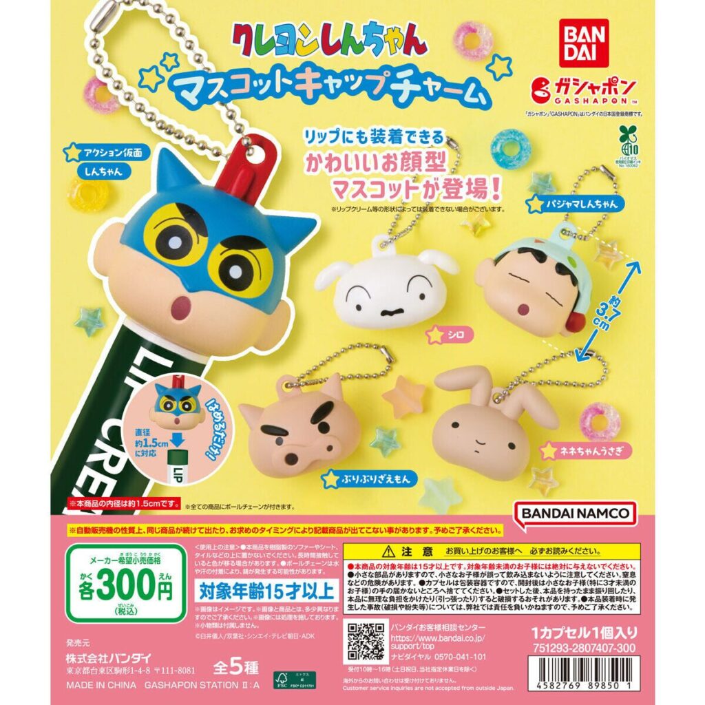 しんちゃん(アクション仮面ver./パジャマver.)をはじめ、シロ、ぶりぶりざえもん、ネネちゃんうさぎの全5種をラインナップ。約3cmサイズのころんとした立体フェイスが存在感ばつぐんです。※リップクリームの形状やサイズによっては装着できない場合があります。