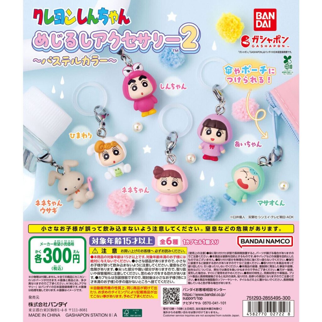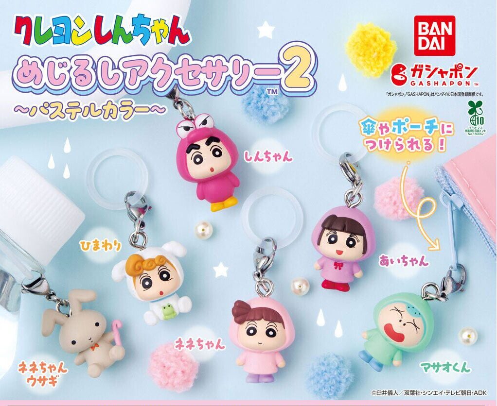 クレヨンしんちゃんのめじるしアクセサリー第2弾がパステルカラーになって登場。しんちゃん・ひまわり・ネネちゃん・ネネちゃんうさぎ・あいちゃん・マサオくんの全6種で、カラビナ付きで傘やポーチ、バッグなどに取り付けて使えるキーチェーンタイプです。