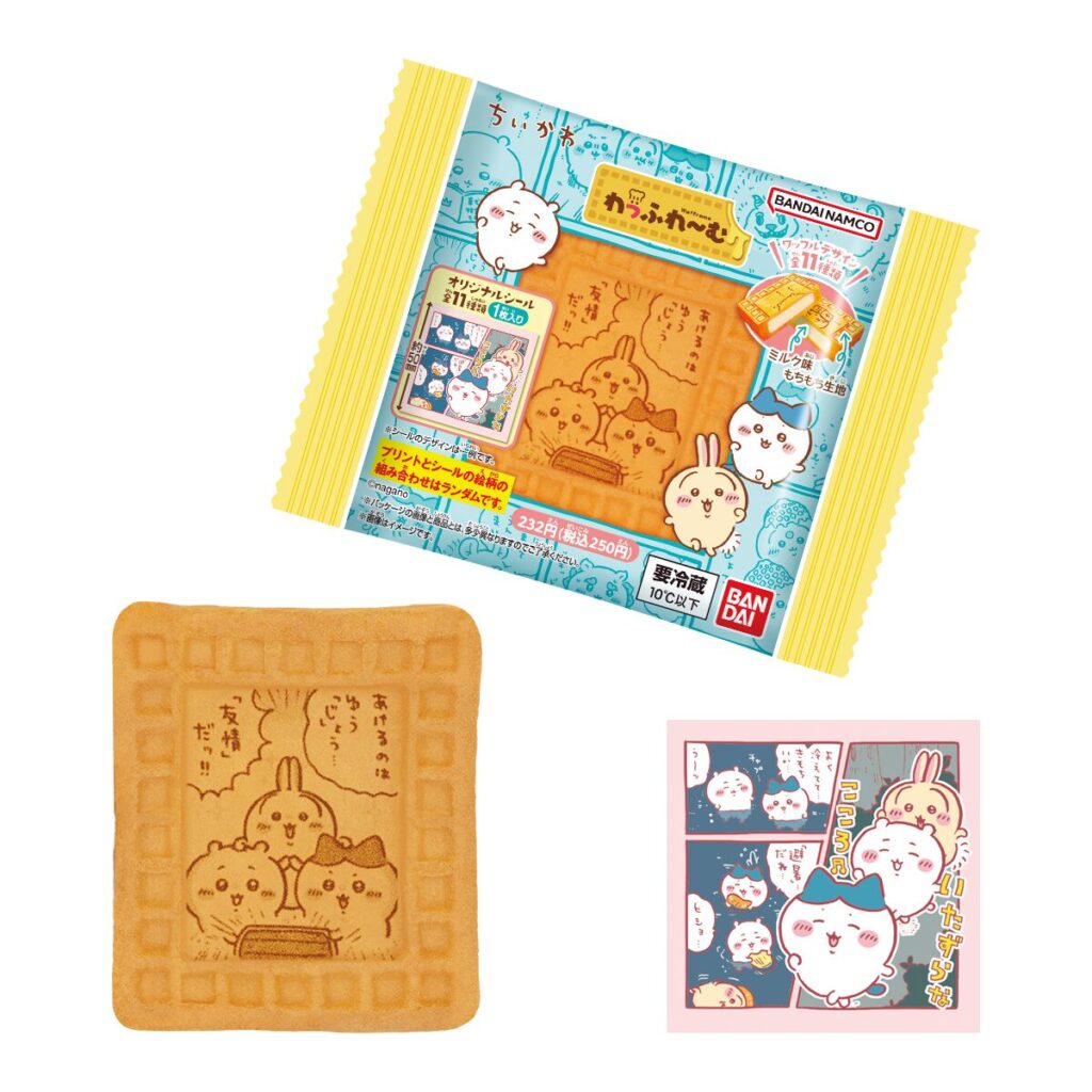 ワッフル表面には、ちいかわのイラスト全11種類を高精細プリント。さらに約50mm四方の正方形シールが1枚付属し、こちらも全11種のオリジナルデザインとなっています。ファミリーマート限定での展開なので、スイーツ売り場をチェックしておきたい商品です。