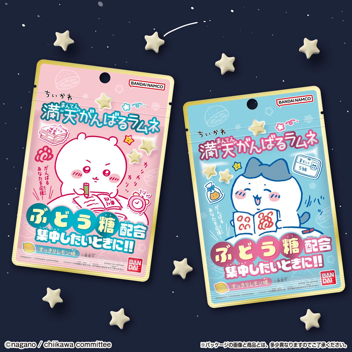 ちいかわデザインの「満天がんばるラムネ」が登場します。ぶどう糖を配合したレモン味のラムネで、ひと息入れたいときに取り入れやすいアイテムです。がんばるちいかわたちが描かれたパッケージも特徴で、持ち運びに便利なチャック付き仕様となっています。