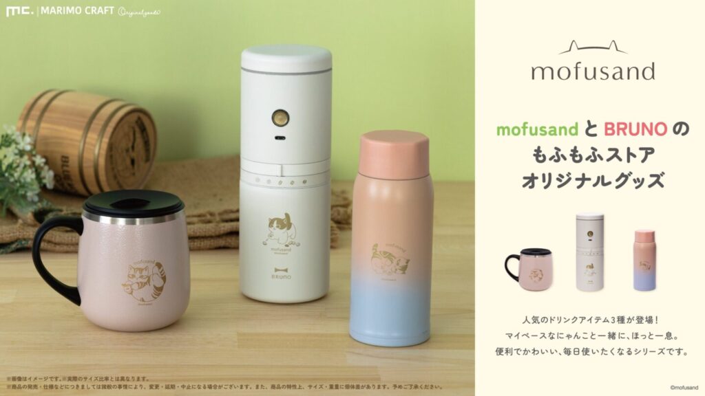 「mofusand」と「BRUNO」のコラボによる、もふもふストアオリジナルグッズが11月7日(金)より発売開始!人気のドリンクアイテム3種が登場し、マイペースなにゃんこと一緒に“ほっと一息”つけるデザインです☕