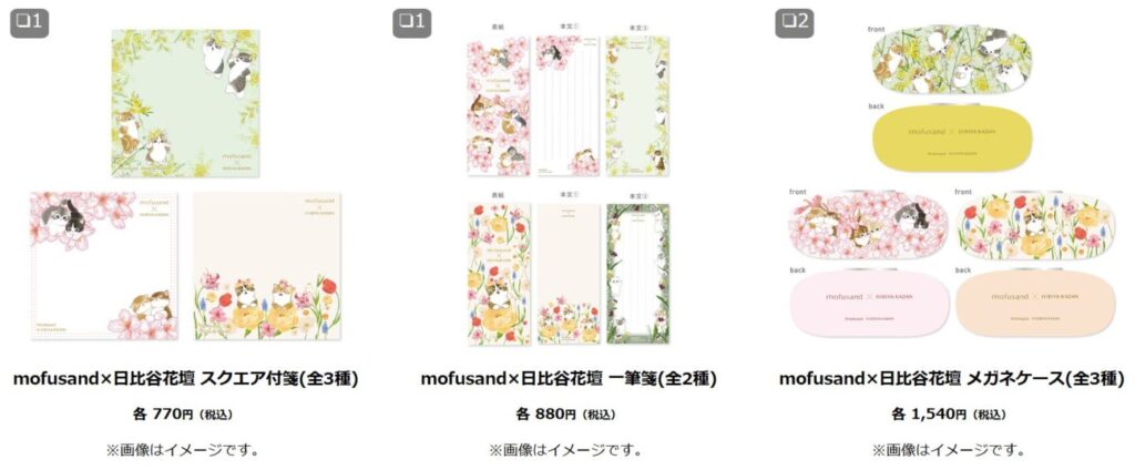mofusandと日比谷花壇のコラボによる雑貨シリーズが登場。お花をテーマにしたデザインで、スクエア付箋や一筆箋、メガネケースなど、日常使いしやすいアイテムがラインナップされています。