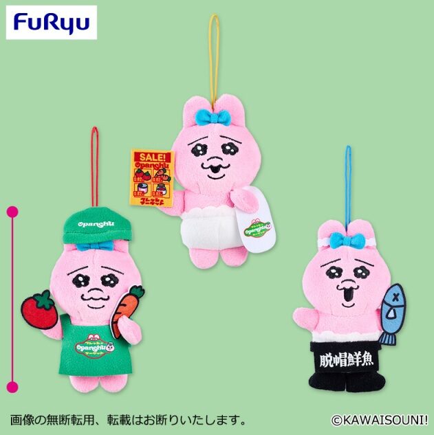 「フレッシュおぱんちゅマーケット」をテーマにしたおぱんちゅうさぎのマスコットがクレーンゲーム景品として登場。店員風やお買い物姿など、マーケットらしいシチュエーションが楽しめるデザインのぬいぐるみマスコットです。