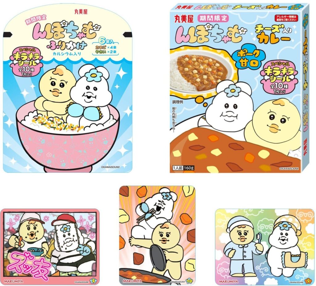 「んぽちゃむ」をデザインした期間限定のふりかけとチーズ入りカレーが登場。毎日のごはんに取り入れやすい食品アイテムで、パッケージでもんぽちゃむの世界観を楽しめるシリーズです。どちらにも丸美屋スペシャルのキラキラシールが1枚付いています。