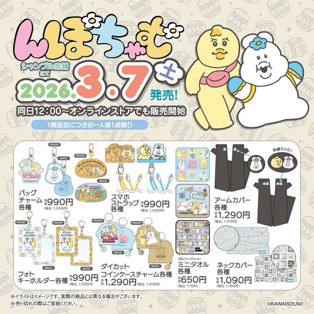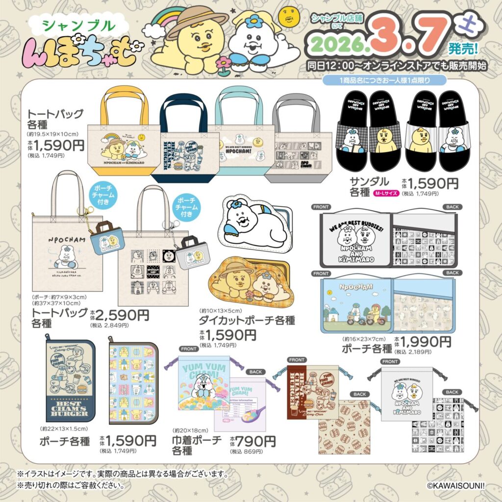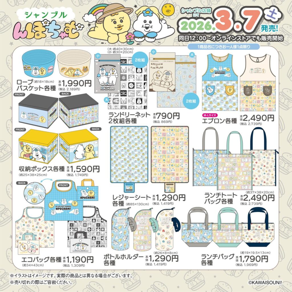 さらに、収納ボックスやレジャーシート、ランチバッグ、タオルなど生活雑貨も多数ラインナップ。かわいいデザインのアイテムを揃えて、んぽちゃむの世界観を日常で楽しめるコレクションになっています。店舗販売に加えて、同日12:00からオンラインストアでも販売がスタートします。