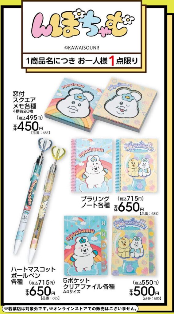 アベイル店舗にて「んぽちゃむ」のステーショナリーグッズが登場。メモ帳やクリアファイル、ボールペンなど、普段使いしやすい文房具アイテムがラインナップされています。