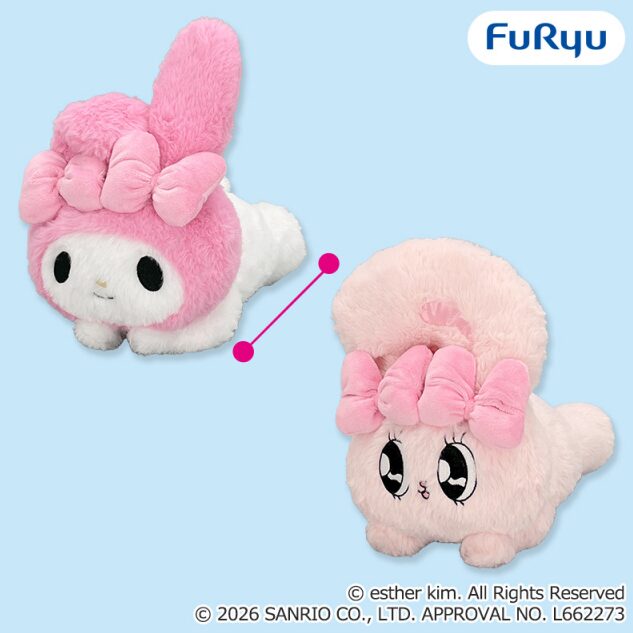 エスターバニーとマイメロディのコラボぬいぐるみが登場。寝そべりポーズがとてもキュートなデザインです。