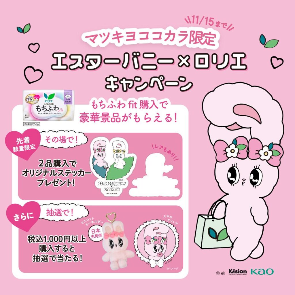 ロリエとエスターバニーの特別コラボがマツキヨココカラ限定で開催中!対象の「もちふわfit」を購入すると先着でステッカーがもらえ、さらに抽選で日本未発売のマスコットキーホルダーが当たるチャンスも。かわいさ満点の限定企画です。