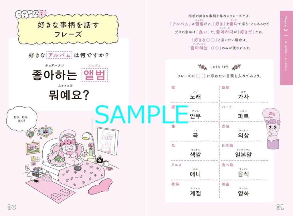 「声出して!」「一緒に歌いましょう」などライブ現場で役立つフレーズから、「エンディング妖精」「入オタ」などSNSやファン交流に使える言葉まで幅広く掲載。韓国語教室「K Village 韓国語」監修による丁寧な解説で、単語の使い方や文化背景も理解しやすく、日常会話や旅行にも応用できる充実の内容です。