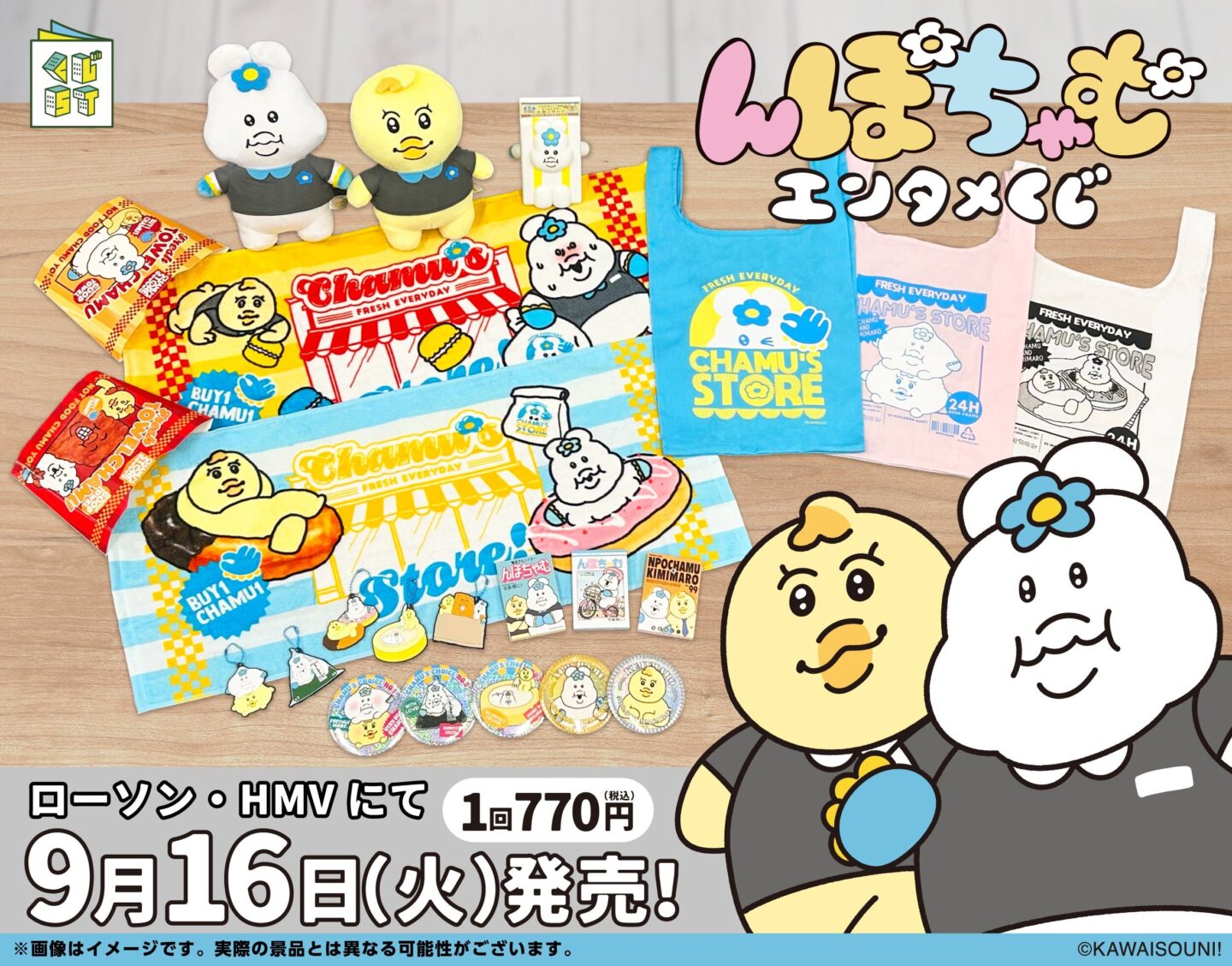 2025年9月16日(火)より、ローソングループ限定で『んぽちゃむ』のエンタメくじが発売決定!今回のテーマは「CHAMU’S STORE」。んぽちゃむときみまろが働くコンビニを舞台にした描き下ろしデザインの景品がずらりと登場します。
