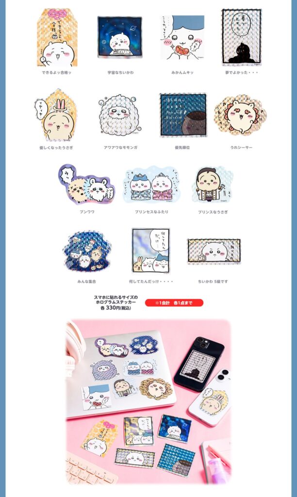 今回の新作では、ちいかわとハチワレがプリンセス姿になった特別仕様のマスコットが登場!さらに、うさぎは王子様スタイルでラインナップされており、華やかな世界観が魅力です。そのほか、ホログラム仕様のステッカーや日常使いしやすいアイテムも多数展開!