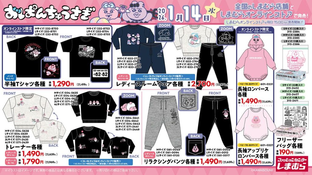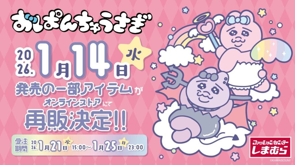 1/14(水)発売「おぱんちゅうさぎ」の一部アイテムが、しまむらオンラインストアにて受注生産販売で再登場します。