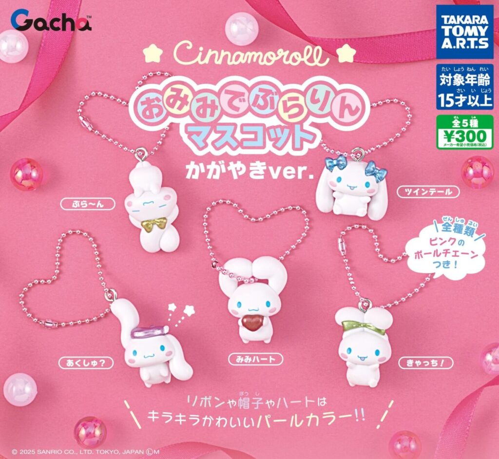 大人気「シナモロール」から、おみみがぶらりと揺れる可愛いマスコット「おみみでぶらりんマスコット かがやき ver.」が登場!キラキラのリボンや帽子がポイントで、どの角度から見ても輝くかわいさ。お気に入りのシナモンをカバンにつけて一緒にお出かけしたくなるアイテムです。