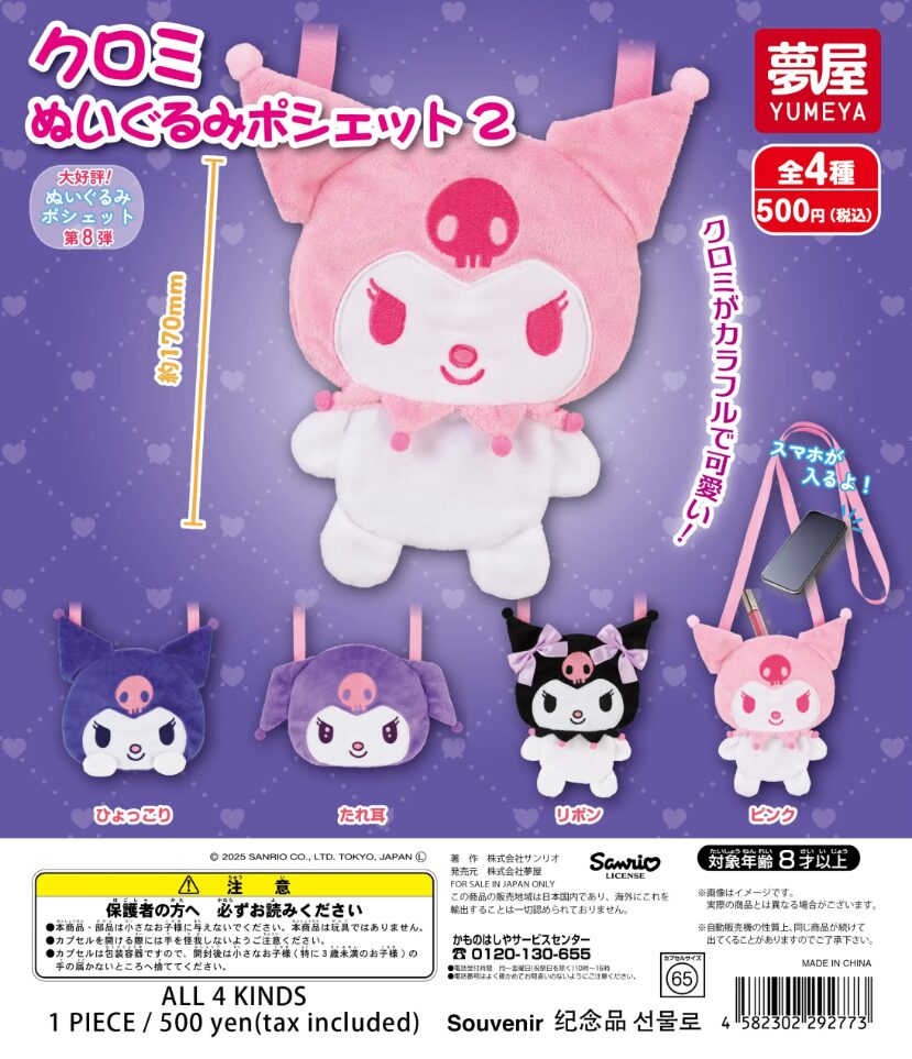 サンリオの人気キャラクター「クロミ」から、待望の第2弾「ぬいぐるみポシェット2」が登場💜 もふもふ素材で仕上げられたぬいぐるみタイプのポシェットは、かわいさと実用性を兼ね備えたアイテムです。