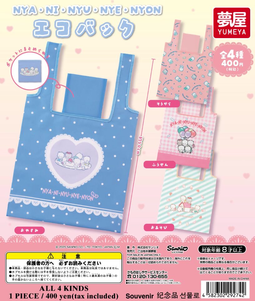 全4種のラインナップは、どれも持ち歩きやすいカラーとデザイン。折りたたんでコンパクトに収納できるので、サブバッグとしても便利です。懐かしくてかわいいニャニィニュニェニョンを、ぜひ日常に取り入れてみてください♪