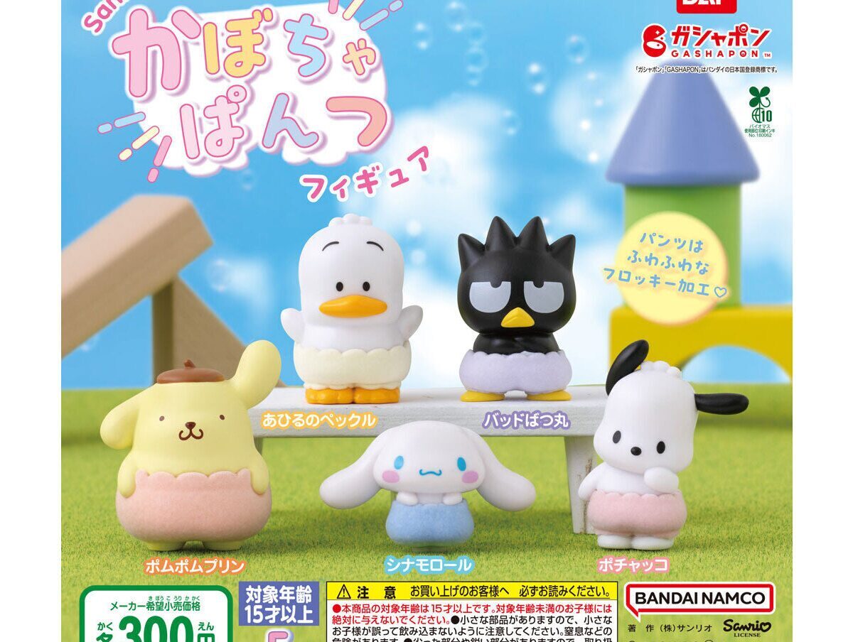 ラインナップはポムポムプリン、シナモロール、ポチャッコ、バッドばつ丸、あひるのペックルの全5種。机や棚に並べて、ほっこり気分を楽しめるフィギュアです♪完全におぱんちゅ感!
