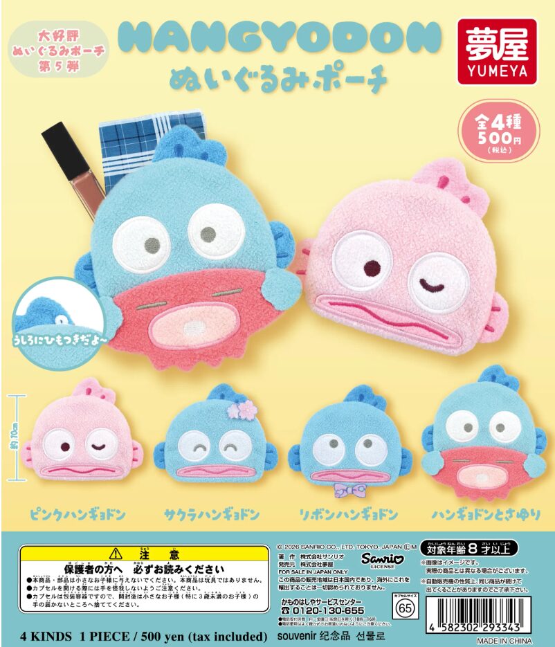 サンリオの人気キャラクター・ハンギョドンが、ころんと可愛いぬいぐるみポーチになって登場。やさしいパステルカラーで仕上げられ、見た目の可愛さと実用性を兼ね備えたカプセルトイです。