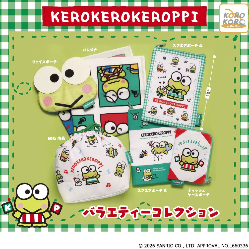 けろけろけろっぴが主役のバラエティーコレクションが登場。フェイスポーチやスクエアポーチ、巾着、バンダナなど、日常使いしやすいアイテムがラインナップされた実用性の高いシリーズです。