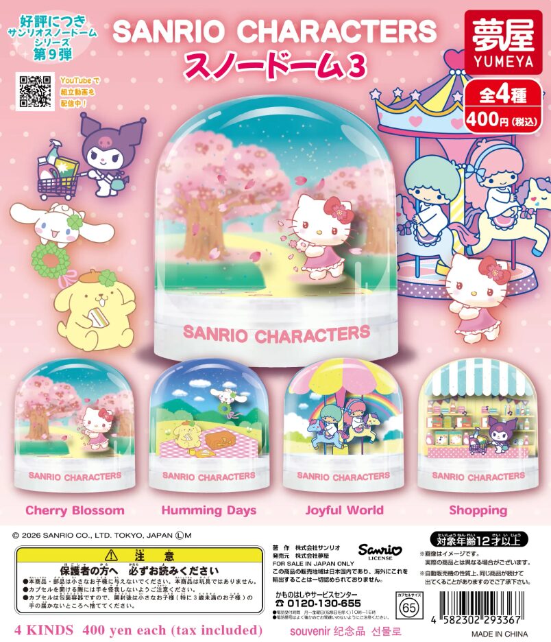 サンリオキャラクターズのスノードームシリーズ第3弾が登場。お花見やピクニック、遊園地、お買い物など、日常を楽しむキャラクターたちのシーンを閉じ込めた、見ているだけで癒されるカプセルトイです。